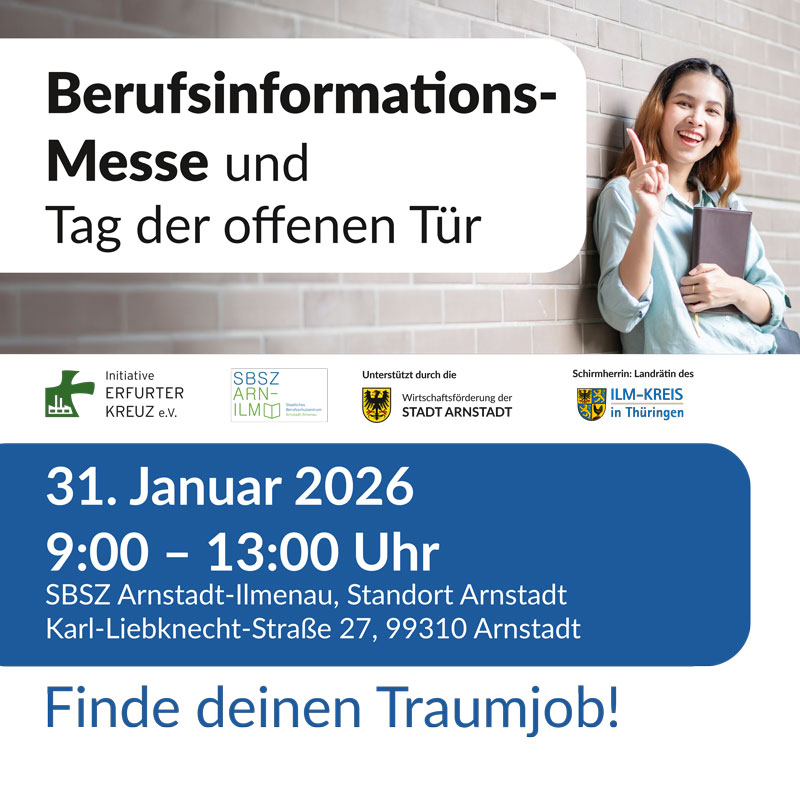 Die Berufsinformationsmesse hat sich seit mehr als 10 Jahren fest etabliert und zieht an diesem Tag zwischenzeitlich jeweils mehr als 1.000 Besucher, Schüler und Eltern in die Räumlichkeiten des Berufsschulzentrums nach Arnstadt.