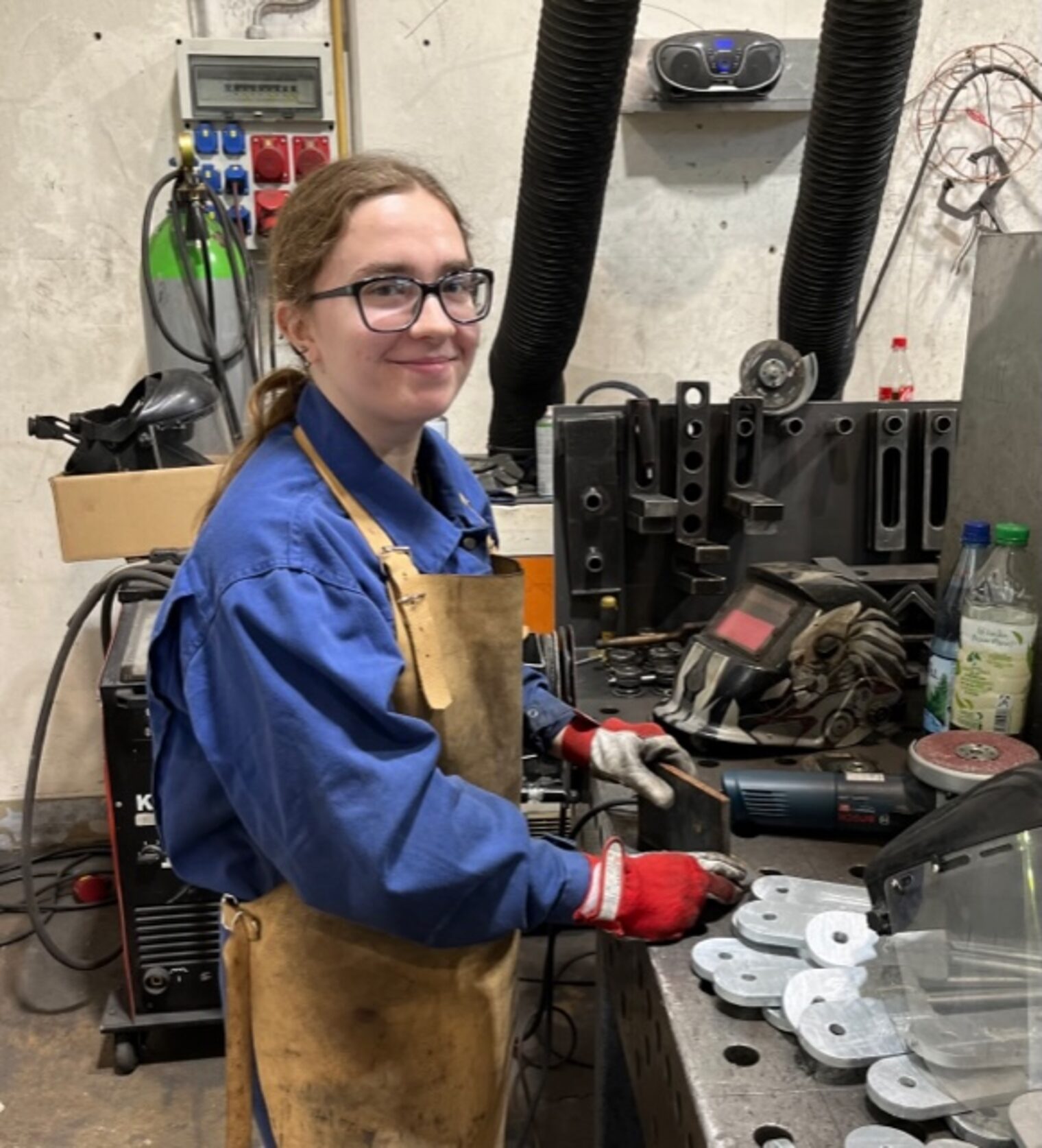 In der Berufsschule steht das theoretische Fundament aus Werkstoffkunde, Technik, Mathematik oder Konstruktion im Mittelpunkt. Arbeitssicherheit und -planung stehen ebenfalls auf dem Plan. Seit 2022 ist Florentine außerdem Ausbildungsbotschafterin und gibt Jugendlichen Einblicke in die Ausbildung und den Berufsalltag. „Mein Chef hat mich darauf gebracht. Und ich fand die Idee super, anderen zu zeigen, wie cool mein Beruf ist. Da ich früher lange vor hatte, Lehrerin zu werden, passt das irgendwie ganz gut zu mir.“